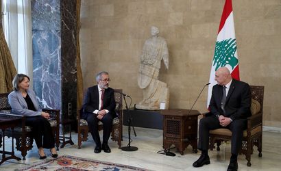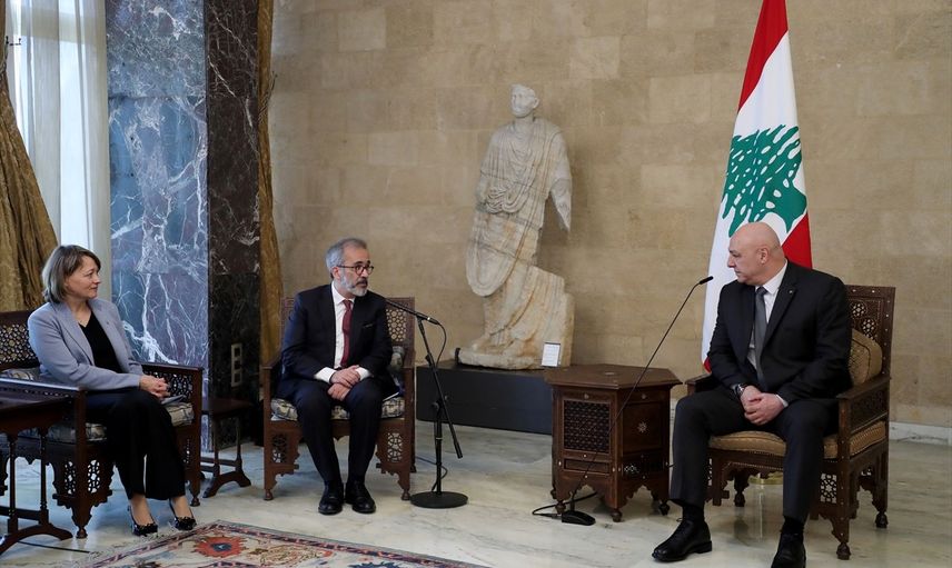 Lübnan Cumhurbaşkanı Joseph Avn (sağda), Portekiz Dışişleri Bakanı Paulo Rangel'i (sol 2) başkent Beyrut'taki Baabda Sarayı'nda kabul etti.