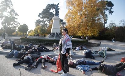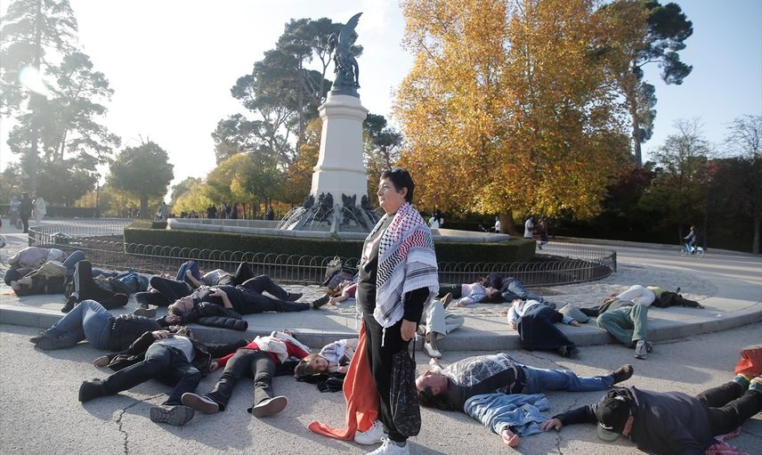 Madrid'in merkezi Retiro Park'taki "Şehit Melek Çeşmesi" önünde toplanan İspanyol vatandaşı bir grup, "Filistin için yere yat. Çocukların bombalanmasına dur." temalı bir gösteri gerçekleştirdi. Eylem, yalnızca 5 dakika boyunca sessizce yerde yatarak gerçekleştirildi.