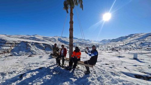 Malatya Akçadağ Kozluca Mahallesi'nde bin 600 rakımda bir grup arkadaş, kar yağışı sonrası ağaç etrafına kurdukları merdivenle dönerken ve salıncakta kışın tadını çıkardı.