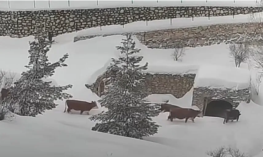 Görüntülerde, büyükbaş hayvanların karla kaplı yollarda güçlükle ilerlediği ve sürü sahiplerinin hayvanları güvenli bölgelere yönlendirmeye çalıştığı izleniyor. Bu sahneler, bölgedeki hayvancılık faaliyetlerinin yoğun kar koşullarından nasıl etkilendiğine dair somut bir örnek sunuyor.