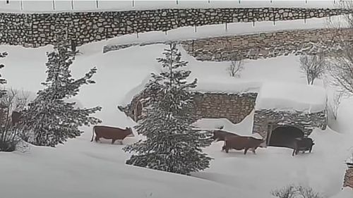 Malatya'nın Arapgir ilçesinde yer yer yarım metreye ulaşan kar, Onar Mahallesi'nde büyükbaş hayvanların karla kaplı yollarda güçlükle ilerleyişini kameraya yansıttı.