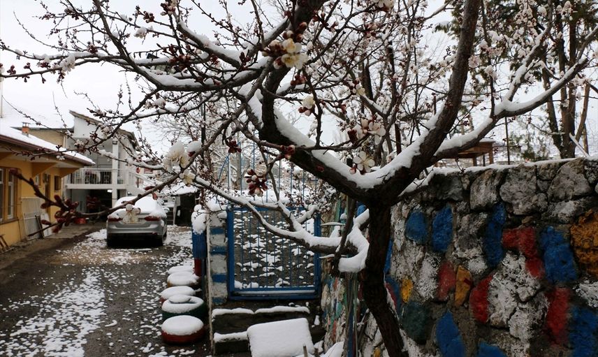 Malatya'nın Hekimhan ilçesinde kar yağışı etkisini sürdürüyor. İlçede çiçek açan kayısı ağaçları beyaza büründü.