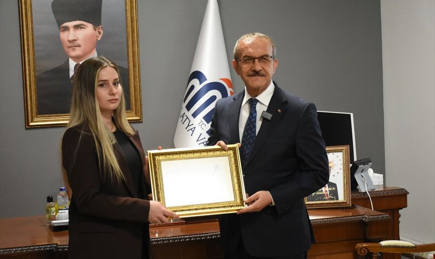 Malatya Valisi Seddar Yavuz, dün Kale ilçesinde 5,9 büyüklüğündeki deprem anında Mehmet Akif İlkokulu'nda eğitim gören engelli öğrenciyi kucağında taşıyan öğretmen Şura Özçelik'e başarı belgesi verdi.