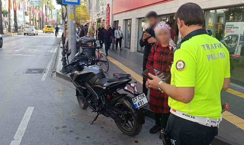 Manavgat İlçe Emniyet Müdürlüğü Trafik Denetleme Büro Amirliği ekipleri, Antalya Caddesi'nde devriye görevindeyken seyir halindeki motosikletin plakasının bandana ile kapatıldığını fark ederek aracı durdurdu.