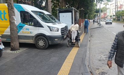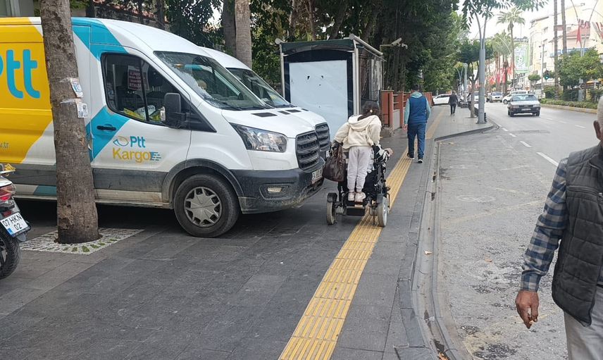 Antalya'nın Manavgat ilçesinde, PTT Manavgat şubesi önünde park eden PTT minibüslerinin kaldırımı ve engellilere ayrılmış geçişi kapattığı bildirildi. Olay bu sabah saatlerinde meydana geldi; her gün aynı güzergahtan geçen engelli bir vatandaş, sarı ile işaretlenmiş engelli geçişinden ilerleyemedi.