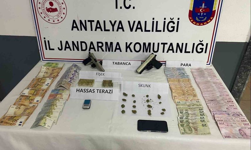 Jandarma ekiplerinin R.U. isimli şüphelinin evinde ve iş yerinde yaptığı aramalarda; 50 gram skunk, 1 hassas terazi, 2 ruhsatsız 9x19 milimetre tabanca, 82 adet 9x19 milimetre tabanca fişeği, 1 cep telefonu, bin 465 avro, 110 sterlin ve 14 bin 50 lira nakit para ele geçirildi.