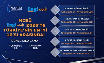 ENGİRANK 2025 SONUÇLARINA GÖRE TÜRKİYE’DE 16., AVRUPA’DA 226. SIRAYA YERLEŞEN MANİSA CELAL BAYAR ÜNİVERSİTESİ, MÜHENDİSLİK EĞİTİMİNDEKİ NİTELİKLİ AKADEMİK ÜRETİMİ VE ULUSLARARASI PROJE BAŞARILARIYLA DİKKAT ÇEKTİ. MAKİNEDEN ÇEVRE MÜHENDİSLİĞİNE BİRÇOK ALANDA TÜRKİYE’DE İLK 20’YE GİREN MANİSA CELAL BAYAR ÜNİVERSİTESİ, AVRUPA YÜKSEKÖĞRETİM ALANINDA REKABET GÜCÜNÜ ARTIRARAK ULUSLARARASI GÖRÜNÜRLÜĞÜNÜ SAĞLAMLAŞTIRDI.