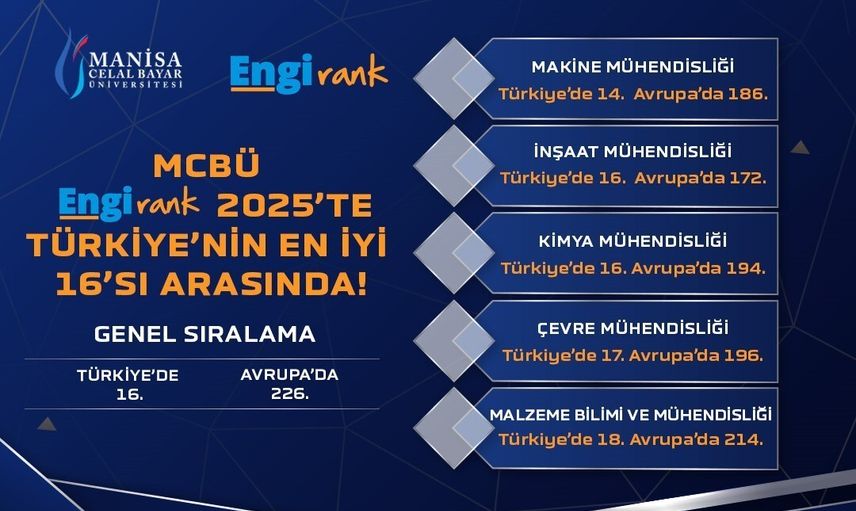 European Ranking of Engineering Programmes (EngiRank) 2025 sonuçlarına göre Manisa Celal Bayar Üniversitesi, mühendislik alanındaki performansıyla Türkiye'de 16., Avrupa'da ise 226. sırada yer aldı. Kurum, akademik üretim, uluslararası projelerdeki başarısı ve disiplinler arası çalışmalarla öne çıktı.