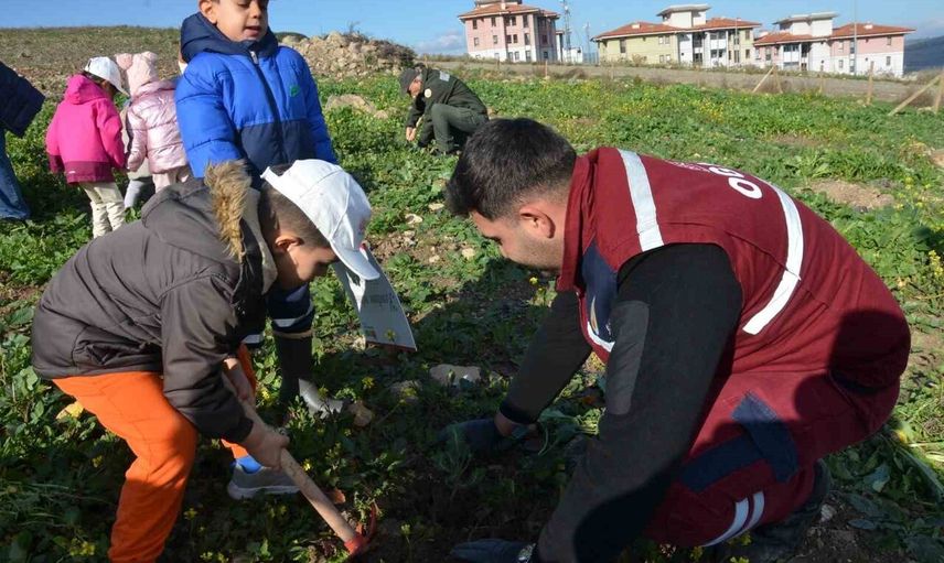 Manisa’da yanan ormanlık alanların ağaçlandırılması kapsamında yürütülen çalışmalarda 100 bininci fidan, bir özel anaokulunun minik öğrencileri tarafından toprakla buluşturuldu.