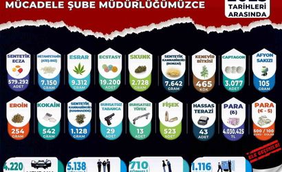 Narkotik ekiplerinin operasyonlarında ele geçirilen maddeler ve malzemeler, yürütülen mücadelenin kapsamını ortaya koydu. Aramalarda ele geçirilenler arasında 579 bin 292 adet sentetik ecza, 19 bin 200 adet ecstasy, 3 bin 77 adet captagon, 9 kilo 312 gram esrar, 7 kilo 642 gram bonzai (sentetik kannabinoid), 7 kilo 150 gram metamfetamin, 2 kilo 728 gram skank, 1 kilo 128 gram bonzai hammaddesi, 542 gram kokain, 254 gram eroin, 105 gram afyon sakızı ve 465 kök kenevir bitkisi yer aldı.