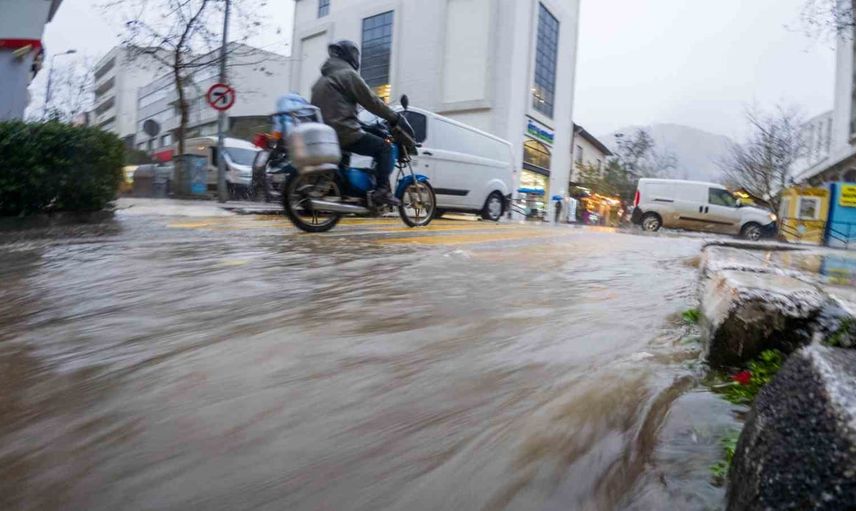 Yağmur sonrası cadde kenarlarının dere yatağı görünümüne dönmesi nedeniyle vatandaşlar caddeden kaldırıma geçişte zorlandı. Dükkan önlerinde biriken su, esnafın kapı önlerindeki suların içeri girmesini engellemek için müdahalede bulunmasına yol açtı.