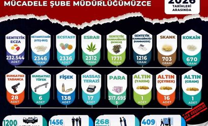 Aramalarda ele geçirilenler arasında 232 bin 544 adet sentetik ecza hap, 2312 gram esrar, 2346 gram metamfetamin, 1216 gram sentetik kannabinoid hammaddesi, 1771 gram bonzai, 703 gram skunk, 670 gram kokain ve 2 bin 336 adet extacy yer aldı.