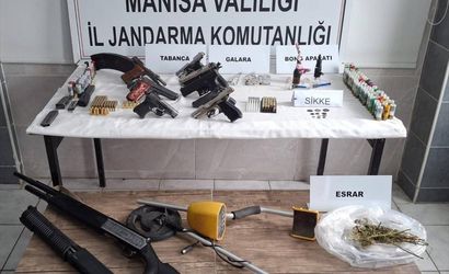 Manisa'nın Salihli ve Turgutlu ilçelerinde düzenlenen uyuşturucu ve silah kaçakçılığı operasyonunda 44 şüpheli gözaltına alındı. Yapılan aramalarda, 10 ruhsatsız tabanca, 11 kuru sıkı tabanca, 33 tüfek, 2 şarjör, 298 tabanca fişeği, 222 tüfek kartuşu, 133 kurusıkı tabanca fişeği, 8 bıçak, 160 gram kubar esrar, 3 gram metamfetamin, 6 sentetik ecza hapı, 5 kök kenevir bitkisi, 2 hassas terazi, 2 esrar öğütme aparatı, 19 uyuşturucu madde kullanma aparatı, 11 sikke ve dedektör ele geçirildi.