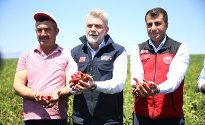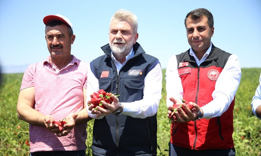 Kahramanmaraş Büyükşehir Belediyesince tarımsal üretimin artırılması projesi kapsamından kent çiftçisine yüzde 75 hibeyle dağıtılan 1 milyon "Maraş biberi" fidesinin buluşturulduğu tarlalarda hasat başladı. Hasada, Büyükşehir Belediye Başkanı Fırat Görgel (ortada) da katıldı.