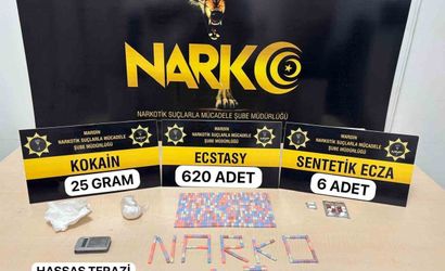 Operasyonda ele geçirilenler arasında 620 adet ecstasy hap, 25 gram kokain, 6 adet sentetik ecza ve 1 hassas terazi yer aldı. Ele geçirilen maddelere el konuldu.