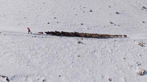Mardin Mazıdağı'nda etkili kar, besicileri arazide mesaiye zorluyor; çobanlar karla kaplı patikalardan sürüleriyle evlerine dönüyor.