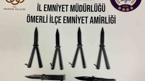 Mardin'in Ömerli ilçesinde polis denetiminde seyyar satıcının tezgahında 4 kelebek ve 3 sustalı bıçak ele geçirildi; şahıs hakkında 6136 kapsamında işlem yapıldı.