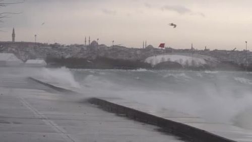 Marmara ve İstanbul'da gece başlayan şiddetli lodos devam ediyor; rüzgar saatte 80 km'ye ulaşırken gemiler Fatih Yedikule açıklarında demirleyerek bekliyor.