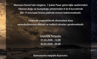 Fırtına uyarısı 1 Şubat 2026 saat 12.00’den başlayarak 2 Şubat 2026 saat 04.00’e kadar geçerli olacak. Yetkililer, beklenen koşulların özellikle deniz ulaşımı üzerinde etkili olabileceğine dikkat çekti.