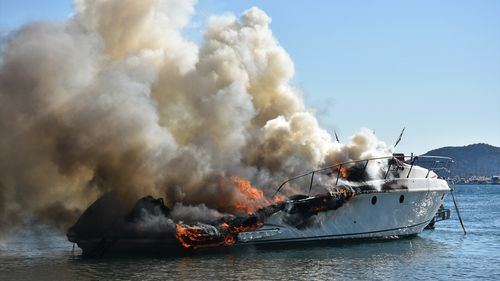 Muğla'nın Marmaris ilçesinde bir motoryatta çıkan yangına müdahale ediliyor, ekipler alevlerin yayılmasını önlüyor.