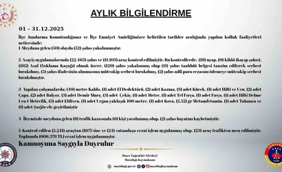 Mardin’in Mazıdağı ilçesinde, 1 Aralık - 31 Aralık 2025 dönemine ilişkin kolluk faaliyetleri ve elde edilen veriler Mazıdağı Kaymakamlığı tarafından yayımlandı. Kaymakamlık raporu, İlçe Jandarma Komutanlığı ve İlçe Emniyet Amirliği tarafından yürütülen operasyonların kapsamını ortaya koyuyor.