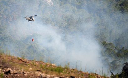 İzmir'in Menderes ilçesinde ormanlık alanda çıkan yangına ekiplerin havadan ve karadan müdahalesi sürüyor. Helikopterler, Tahtalı Barajı'ndan aldıkları su ile yangına müdahale ediyor.