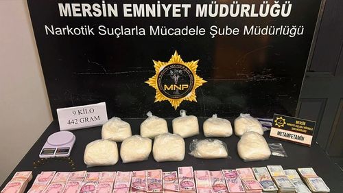 Mersin'de düzenlenen operasyonda 9 kilo 442 gram sentetik uyuşturucu ve çok sayıda yasa dışı malzeme ele geçirildi.