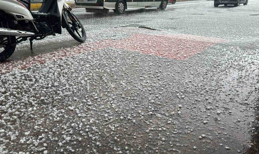 Meteoroloji Genel Müdürlüğü uyarısının ardından kent merkezinde aniden bastıran dolu, kısa sürede bazı bölgeleri beyaza bürüdü ve ulaşımda aksamalara yol açtı.