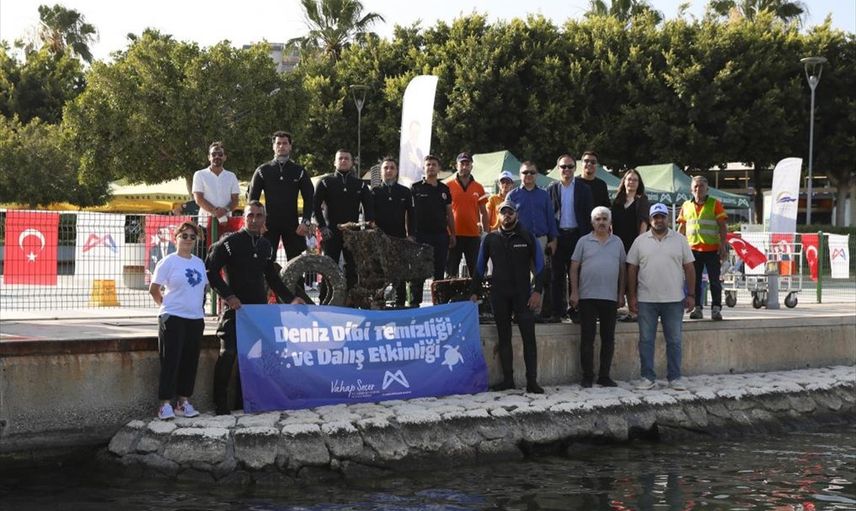 Mersin'de Çevre Haftası etkinlikleri kapsamında dalgıçlar tarafından gerçekleştirilen temizlik çalışmasında denizden araç lastiği, alışveriş sepeti ve çok sayıda atık çıkarıldı.