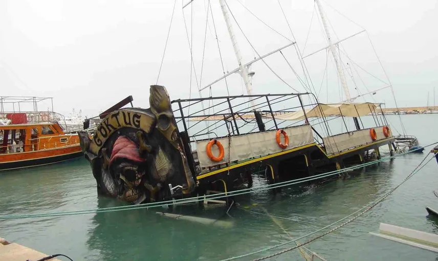 Gece yarısı etkisini artıran fırtına nedeniyle limanda bağlı bulunan, 130 yolcu kapasiteli ve yaklaşık 25 metre uzunluğundaki Göktuğ isimli gezi teknesi su alarak battı.