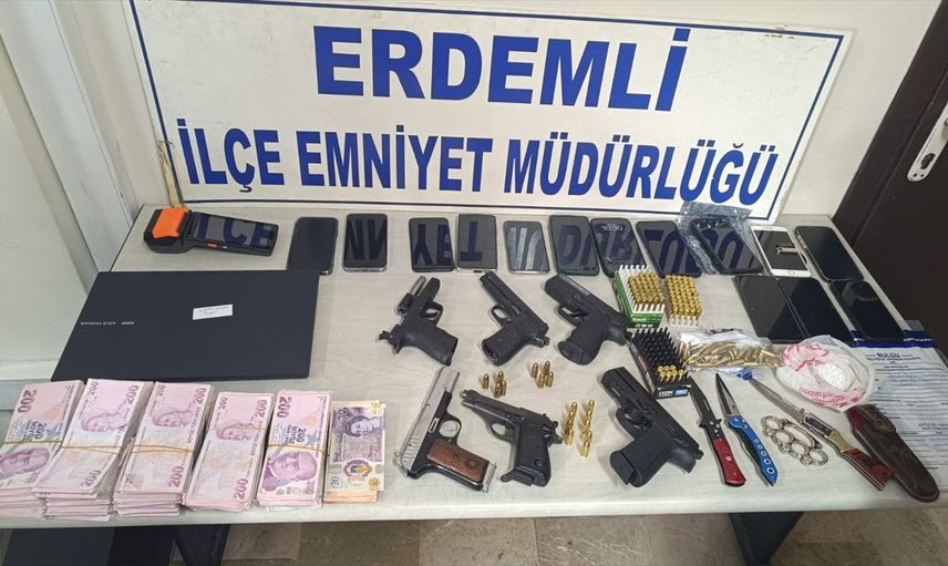 Erdemli Cumhuriyet Başsavcılığı'nın koordinesinde, Erdemli İlçe Emniyet Müdürlüğü ekiplerinin yaptığı çalışmalar neticesinde belirlenen adreslere baskınlar düzenlendi. Yapılan operasyonlarda 22 şüpheli gözaltına alındı. Yapılan aramalarda ise suçtan elde edildiği değerlendirilen 300 bin lira, 6 tabanca, muşta, bıçak ve bir miktar uyuşturucu madde ele geçirildi.