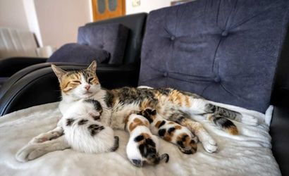 Mersin'de bir camideki vaaz kürsüsünün altında doğum yapan kedi ile 3 yavrusu Kısmet Efetürk'e sahiplendirildi.