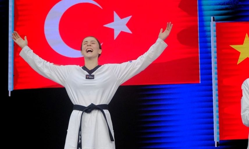 Milli sporcu Merve Dinçel Kavurat (solda), Çin'de düzenlenen Dünya Tekvando Şampiyonası'nda altın madalya kazandı.