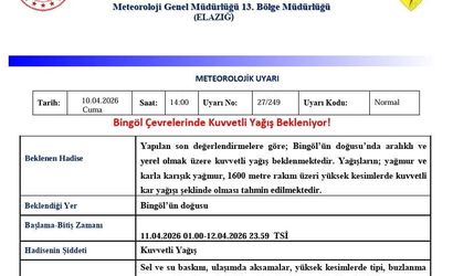 Yapılan son değerlendirmelere göre; Bingöl’ün doğusunda aralıklı ve yerel olmak üzere kuvvetli yağış beklenmektedir. Yağışların; yağmur ve karla karışık yağmur, 1600 metre rakım üzeri yüksek kesimlerde kuvvetli kar yağışı şeklinde olması tahmin edilmektedir.