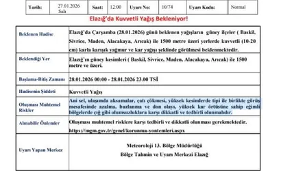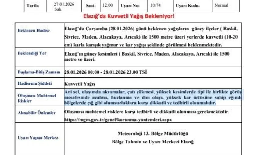 Açıklamada, güney ilçeler (Baskil, Sivrice, Maden, Alacakaya, Arıcak) ile 1500 metre üzeri yerlerde kuvvetli (10-20cm) karla karışık yağmur ve kar yağışı şeklinde görülmesinin beklendiği ifade edildi.