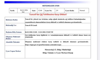 Meteoroloji 13. Bölge Müdürlüğü, Tunceli için çığ tehlikesine karşı uyarı yayımladı.