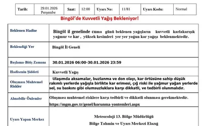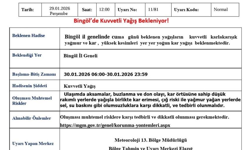Meteoroloji 13. Bölge Müdürlüğü, Bingöl il genelinde cuma günü beklenen yağışlarla ilgili açıklama yaptı.
