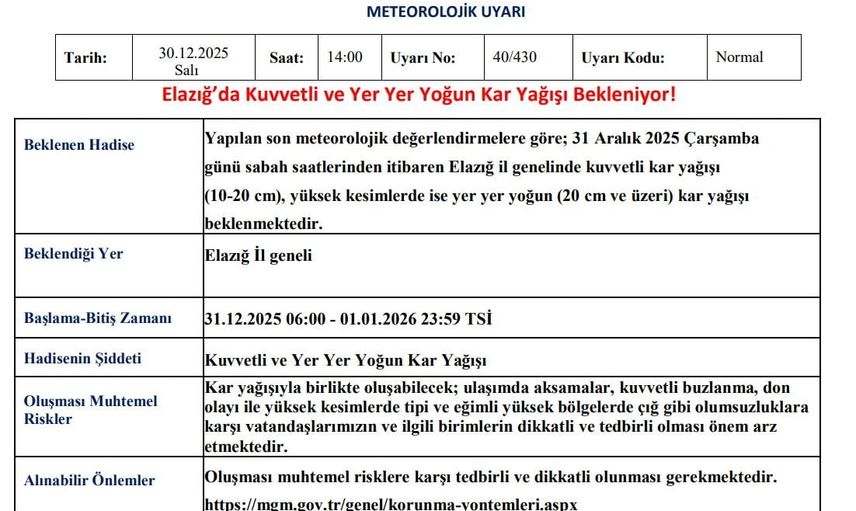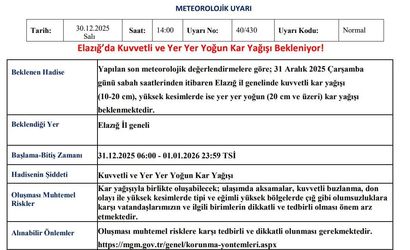 Meteoroloji 13. Bölge Müdürlüğü, Elazığ ili için 31 Aralık 2025 Çarşamba günü sabah saatlerinden itibaren yoğun kar yağışı beklendiğini bildirdi. Yapılan değerlendirmelere göre il genelinde 10-20 cm, yüksek kesimlerde ise yer yer 20 cm ve üzeri kar bekleniyor.