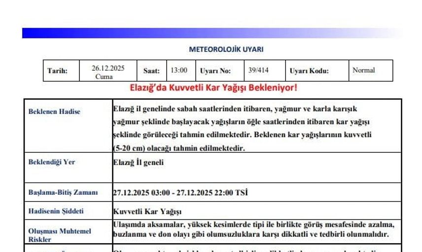 Meteoroloji 13. Bölge Müdürlüğü, Elazığ, Bingöl ve Tunceli genelinde sabah saatlerinden itibaren başlayacak yağışların öğle saatlerinden itibaren kar şeklinde devam edeceğini bildirdi. Kurum, beklenen kar miktarının 5-20 cm arasında olmasının tahmin edildiğini belirtti.