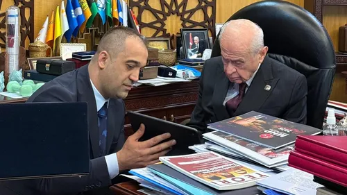 MHP Erzurum İl Başkanı Adem Yurdagül, Ramazan çalışmaları hakkında bilgilendirme yapıp, Hicri 1131 (1718) tarihli Osmanlı kılıcını Devlet Bahçeli'ye takdim etti.