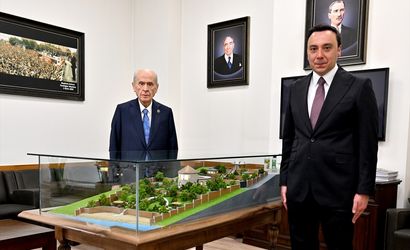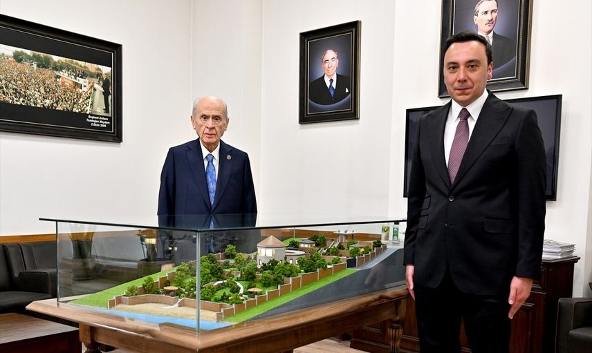 MHP Genel Başkanı Devlet Bahçeli'nin Bitlis Ahlat'ta inşa ettirdiği, Akkoyunlu beylerinden Emir Bayındır bin Rüstem'in defnedildiği kümbetin mimarisinin esas alındığı Emir Bayındır Yerleşkesi Devlet Bey Konağı'nın yapımı tamamlandı. MHP Genel Başkanı Devlet Bahçeli (solda), Mimar Hayri Bulut (sağda) ile birlikte konağın maketini inceledi.
