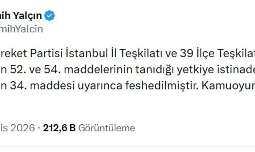 Yalçın, sosyal medya üzerinden paylaştığı açıklamada, işlemin parti tüzüğünün ilgili maddelerine dayandırıldığını belirtti. Açıklamada yer alan ifade şu şekilde: "Milliyetçi Hareket Partisi İstanbul İl Teşkilatı ve 39 İlçe Teşkilatı, parti tüzüğümüzün 52. ve 54. maddelerinin tanıdığı yetkiye istinaden, yine tüzüğümüzün 34. maddesi uyarınca feshedilmiştir. Kamuoyuna saygıyla duyurulur."