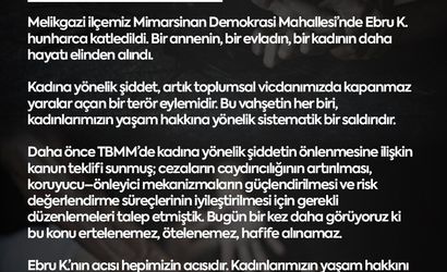 "Bir kadın cinayeti daha. Melikgazi ilçemiz Mimarsinan Demokrasi Mahallesi’nde Ebru K. hunharca katledildi. Bir annenin, bir evladın, bir kadının daha hayatı elinden alındı. Kadına yönelik şiddet, artık toplumsal vicdanımızda kapanmaz yaralar açan bir terör eylemidir. Bu vahşetin her biri, kadınlarımızın yaşam hakkına yönelik sistematik bir saldırıdır."