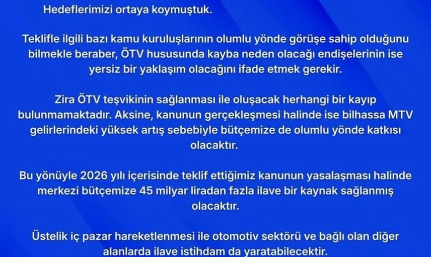Paylaşımda ayrıca, iç pazarın canlanmasının otomotiv sektörü ve bağlı alanlarda hareketlilik ve ek istihdam yaratabileceği kaydedildi. Özdemir, vatandaşların ihtiyaç ve beklentileri doğrultusunda sundukları kanun teklifinin kabul edilip yürürlüğe girmesi için çalışmalarını gayretle sürdürdüklerini belirtti.