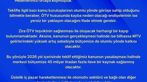 MHP'li Özdemir: ÖTV teşviki kanun teklifiyle 2026'de bütçeye 45 milyar lira ilave kaynak öngörülüyorGenel Başkanvekili İsmail Özdemir'in sosyal medya açıklamasıMilliyetçi Hareket Partisi (MHP) Genel Başkanvekili ve Kayseri Milletvekili İsmail Özdemir, TBMM'ye sundukları kanun teklifine ilişkin değerlendirmelerini sosyal medya üzerinden paylaştı.…