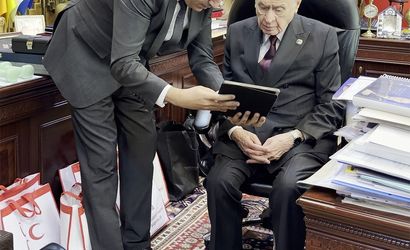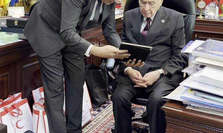 Mucur, 17 ilçede yürütülen "Hayırlı Günler Komşum" ziyaretleri ile "Derdin Derdimizdir" sohbet toplantılarına ilişkin slayt sunumunun yanı sıra 80 sayfalık bilgilendirme dosyasını Genel Başkan Bahçeli'ye takdim etti.