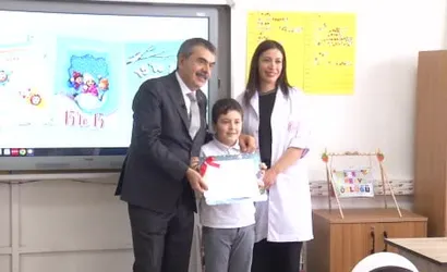Tören öncesinde okul öğretmenleriyle kısa bir toplantı yapan Bakan Tekin, ardından sınıflara girerek öğretmenlerle birlikte karneleri öğrencilere verdi.