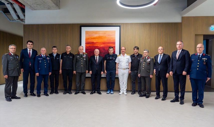 Milli Savunma Bakanı Yaşar Güler (sol 7), İstanbul'da Özdemir Bayraktar Milli Teknoloji Merkezi'ni ziyaret etti. Güler'e ziyarette Genelkurmay Başkanı Orgeneral Metin Gürak (sol 6), Deniz Kuvvetleri Komutanı Oramiral Ercüment Tatlıoğlu (sağ 6), Kara Kuvvetleri Komutanı Orgeneral Selçuk Bayraktaroğlu (sağ 4), Hava Kuvvetleri Komutanı Orgeneral Ziya Cemal Kadıoğlu (sol 3), Bakan Yardımcıları Şuay Alpay (sağ 3) ve Musa Heybet (sol 2), 1'inci Ordu Komutanı Orgeneral Metin Tokel (solda) ve Baykar Yönetim Kurulu Başkanı Selçuk Bayraktar (sağ 7) eşlik etti.