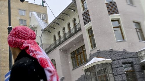 Moskova'daki Suriye Büyükelçiliği'nde, Baas rejiminin bayrağı yerine 'Suriye devrimi bayrağı' çekildi.