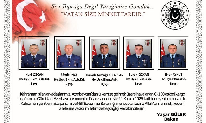 Milli Savunma Bakanlığı (MSB), Azerbaycan'dan Türkiye'ye dönmek üzere havalanan C-130 askeri kargo uçağının Gürcistan-Azerbaycan sınırında düşmesi sonucu 20 askerin şehit olduğunu açıkladı.